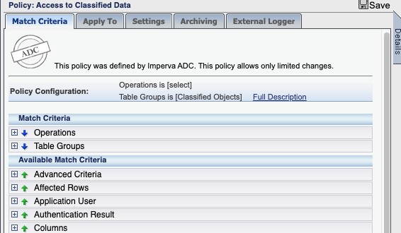 Imperva DAM includes pre-built policies for common regulations such as PCI DSS and SOX. It also has built-in policies for certain types of monitoring actions, such as watching access attempts to sensitive parts of databases or all sensitive information discovered within a scan.