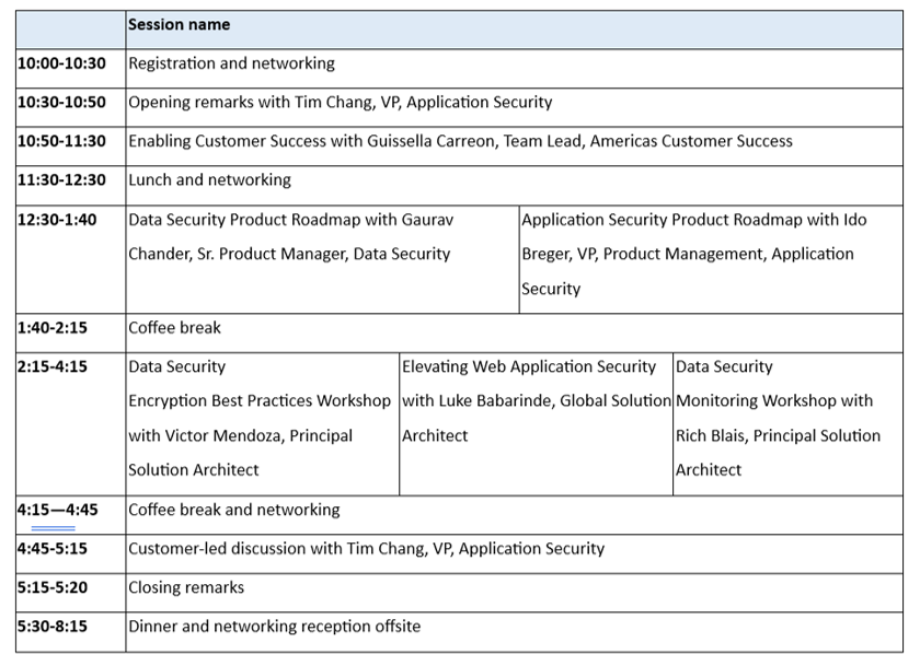 Calling all customers in Dallas - join us for a day of learning and networking on November 6! At the event, you can expect to connect with your peers from other companies who use the same application and data security solutions. See the detailed agenda and registration link below: